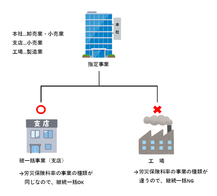 文字で見ると少しややこしいですが、本社(指定事業)と支店(被一括事業)で同じ内容の事業を行っている場合は、継続一括可能と考えていただいて大丈夫です。