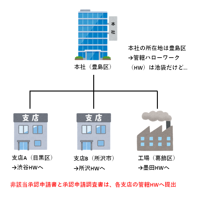 上記の書類を、非該当承認を受けたい事業所を管轄するハローワークに提出します。本社を管轄するハローワークではありませんので、ご注意ください。